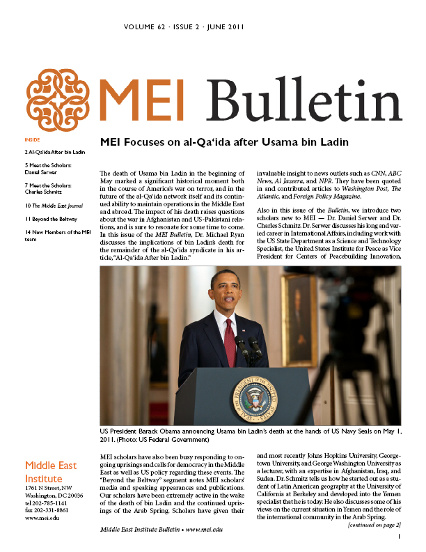 In the June 2011 Bulletin, Dr. Michael Ryan discusses the implications of bin Ladin’s death for the remainder of the al-Qa’ida network. It also introduces new MEI scholars Dr. Daniel Serwer, who is interviewed on his career in technology and peacebuilding, and Dr. Charles Schmitz, who speaks about his work on Yemen.