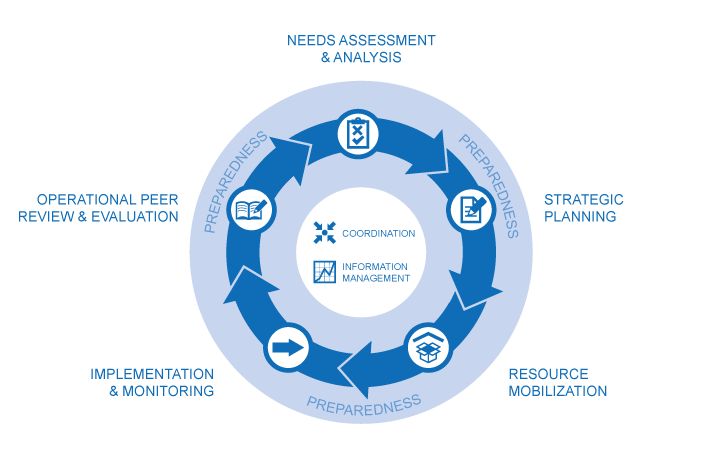According to the U.N. Office for the Coordination of Humanitarian Affairs (O.C.H.A.), the H.P.C. is “a coordinated series of actions undertaken to help prepare for, manage, and deliver humanitarian response.”[7] The approach, which was agreed upon by the Inter-Agency Standing Committee (IASC) Principals as part of The Transformative Agenda, consists of five elements:[8]